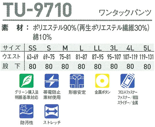 作業服の商品詳細 品 番 タカヤ tu-9710 シーズン 秋冬用 同商品の春夏用モデル TU-9810 素 材 ポリエステル90%(再生ポリエステル繊維30%)・綿10% カラー 3 ストーングレー 5 ネイビー 6 ライトブルー 8 アースグリーン グリーン購入法判断基準 帯電防止素材使用 形態安定 防汚性 金属ボタン フロントファスナー樹脂 機能詳細一覧はこちら 作業服の上下セットを選ぶ際は同シリーズからお選び下さい。